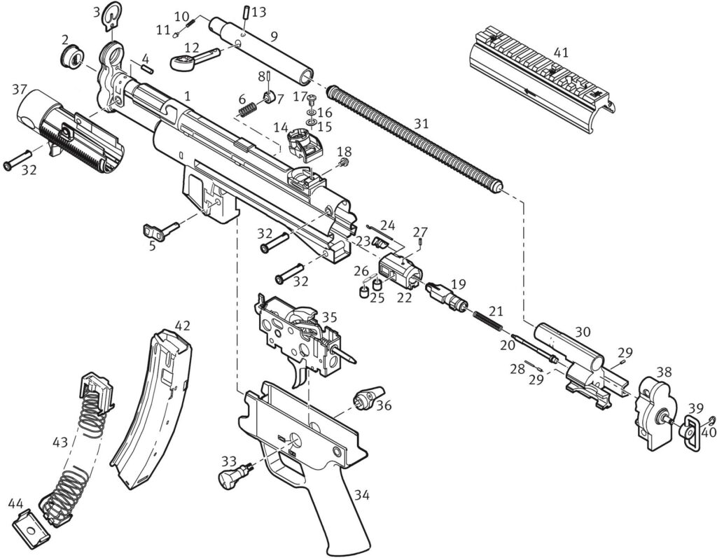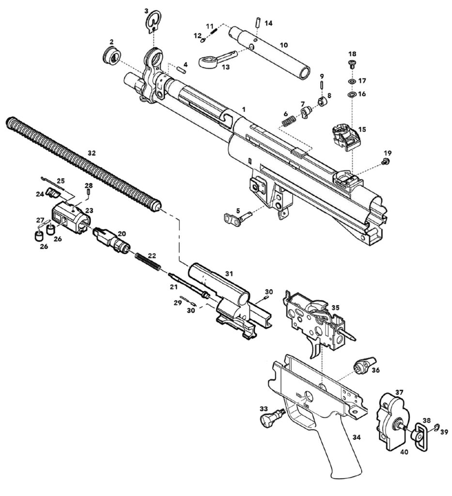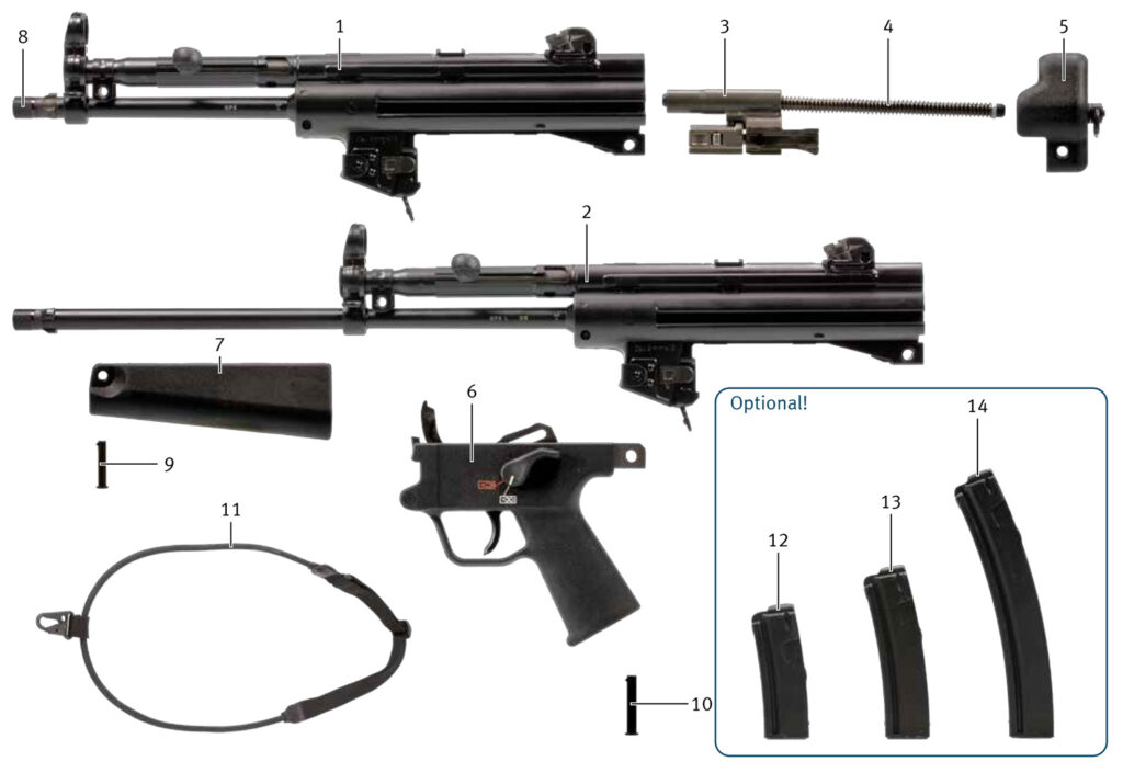 Auf dieser Seite finden Sie umfangreiche Teilelisten, Explosionszeichnungen und weitere Informationen zur Heckler & Koch SP5, SP5L und SP5K, der Zivilversion der bekannten MP5. Von der HK MP5/SP5 gibt es diverse Versionen, die sich in Größe und Details unterscheiden. Grundsätzlich überschneiden sich die meisten Ersatzteile über alle Modelle, sodass Sie sich an den hier zur Verfügung gestellten Listen orientieren können. Bitte prüfen Sie dennoch, ob das hier angegebene Ersatzteil mit dem Teil in der vorliegenden Waffe übereinstimmt.